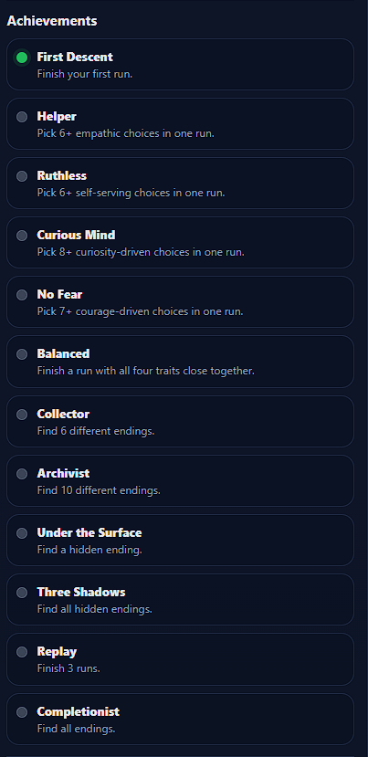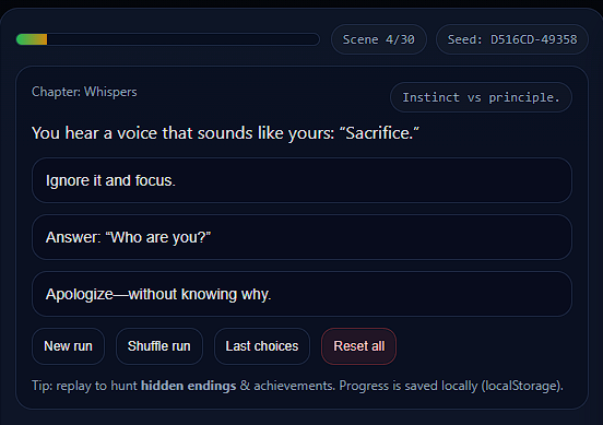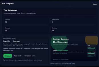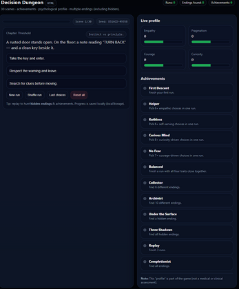 Decision Dungeon is a compact, replayable narrative experience where every choice quietly changes who you become.