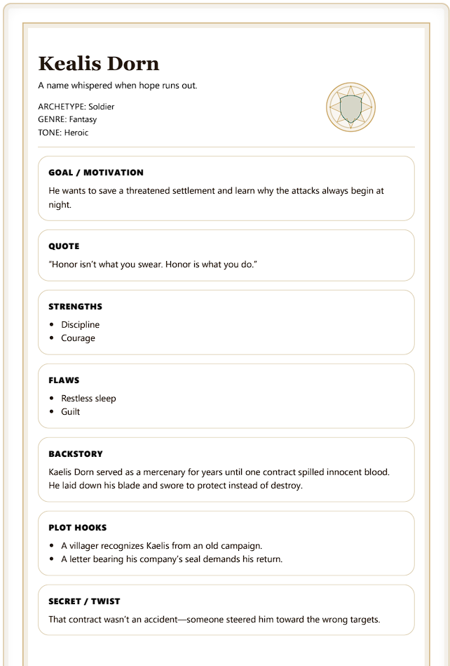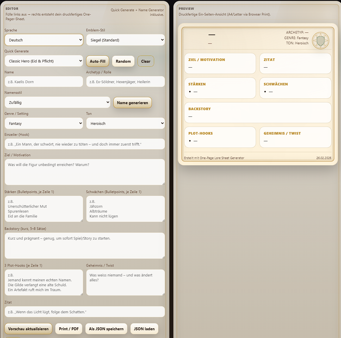 I built it with the same goal I have when I prep for a session: fast creation, zero fuss, and something you can hand to a player (or keep behind the screen) without apologizing for it.