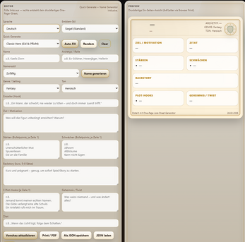 This is a single-file, offline HTML tool that lets you build a clean, print-ready one-page character sheet focused on the stuff that actually matters at the table: a hook, motivation, strengths/flaws, backstory, plot hooks, and a secret that can fuel a whole arc.